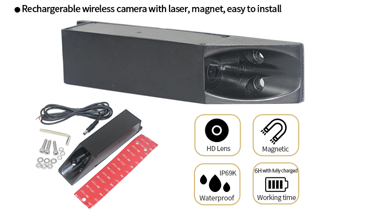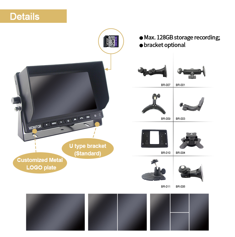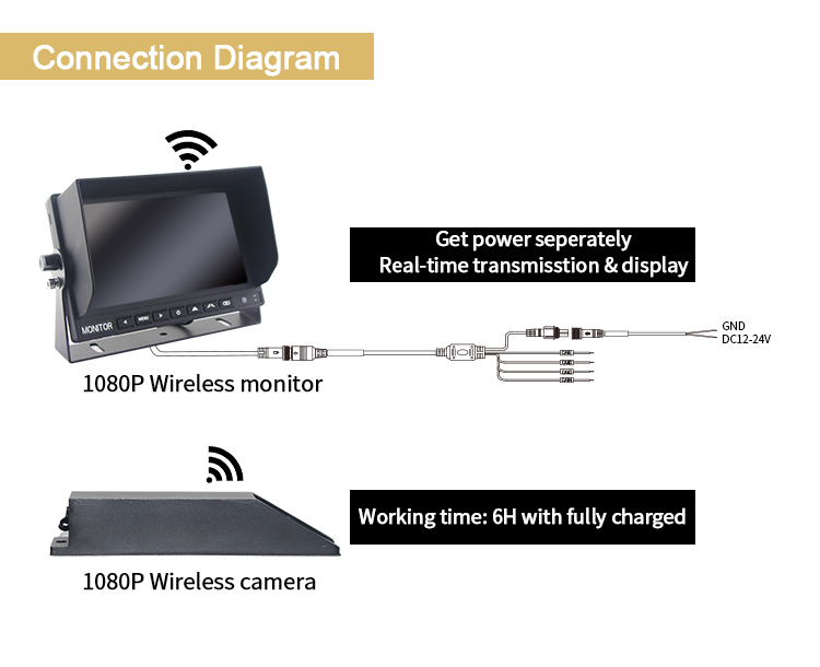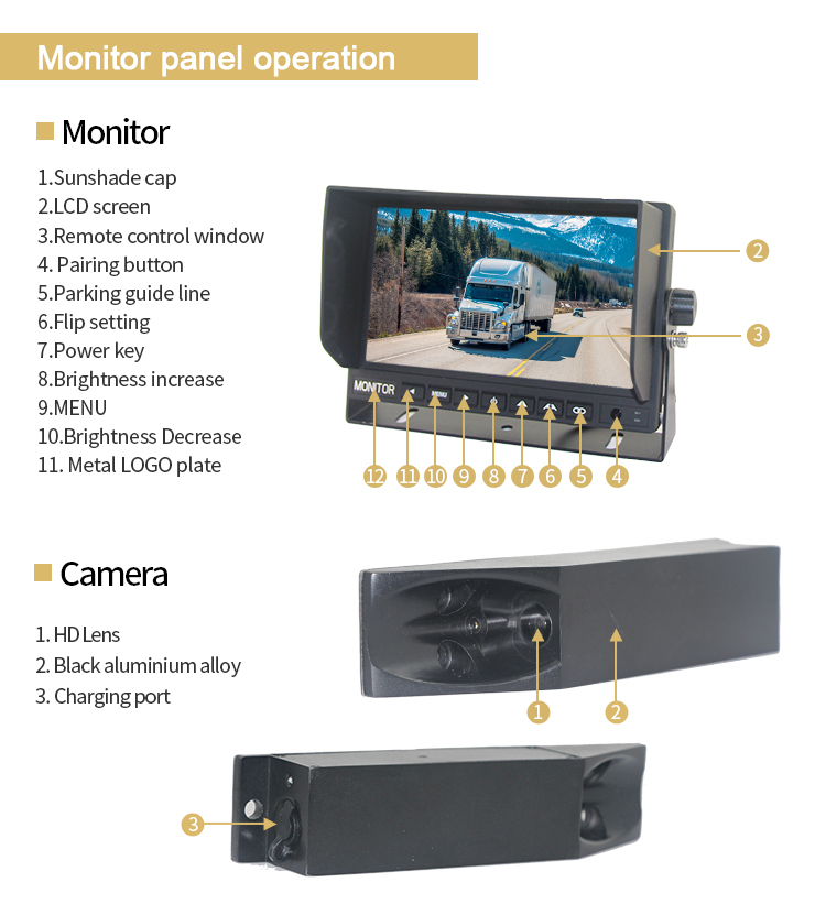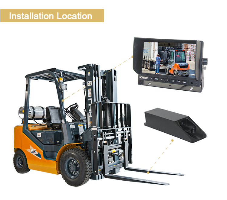 1.1024*600 high resolution, 16:9 wide screen display; 2. IP69K waterproof wireless camera; 3. With DVR function; 4. DC12-24V wide voltage; 5. Applied for forklift, crane and construction machinery vehicles